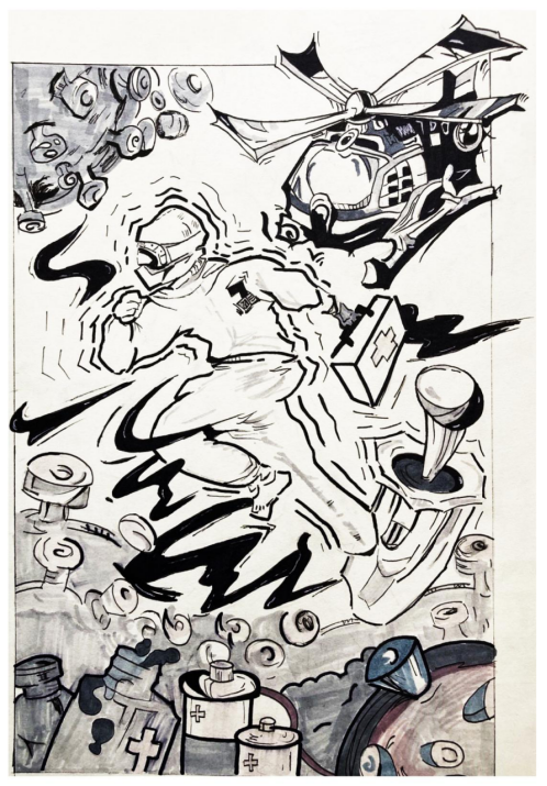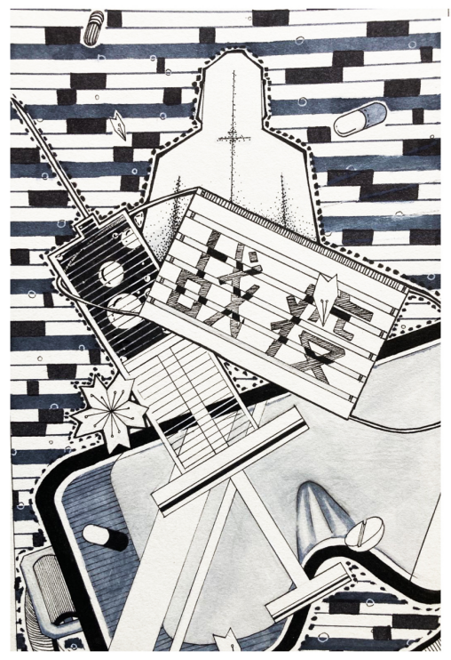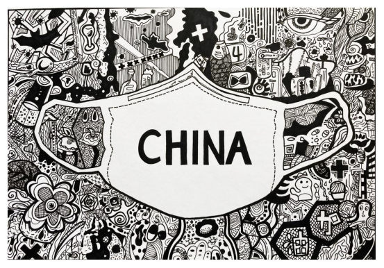 这幅作品采用着一个X型的大框架构图,主体物是有白衣天使抗疫物品组成:针管、口罩、护目镜……表达了我对中国抗疫必胜的信心。