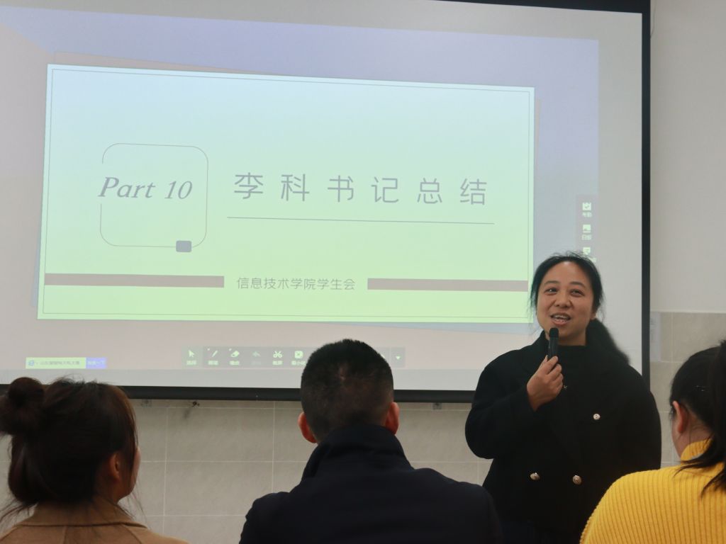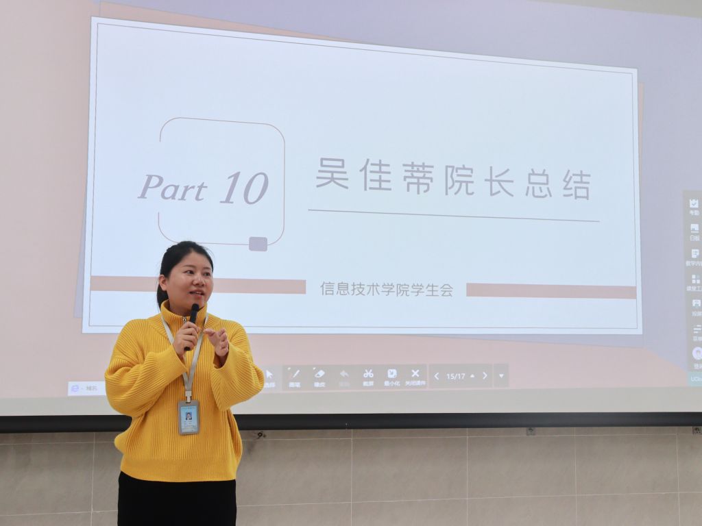 会议第三项,由信息技术学院团学会主席马伟同学发言🚣♂️:“人聚一起叫聚会❤️,心聚一起才叫团队”他深刻认知一个人的能力是有限的,要建设好学生会需要各部门分工合作,结合团队的力量,进而建设更好的信息技术学院,接着他代表全体学生干部对领导和老师们对学生会的认可和关心表达感谢✊🏼,并总结了这一年来学生会的工作以及对新一届成员进行鼓励。