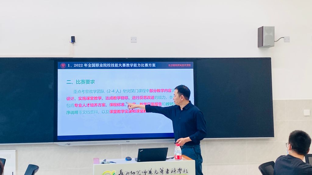 为加强我校内涵式建设,激发教师教学创新动力,深化“三教”教学改革,达到以赛促学🚵🏽‍♀️、以赛促改🗣,以掌握方法为目的,助力教师专业化成长🤵🏼‍♂️,促进我校教师团队高质量发展👳‍♀️。5月8日🧑🏼‍🔧🧑🏼‍🎤,特邀请长沙民政技术学院黄有全教授于技馨楼104室开展主题为“职业院校教师教学能力比赛·策略与实践”的专题讲座。