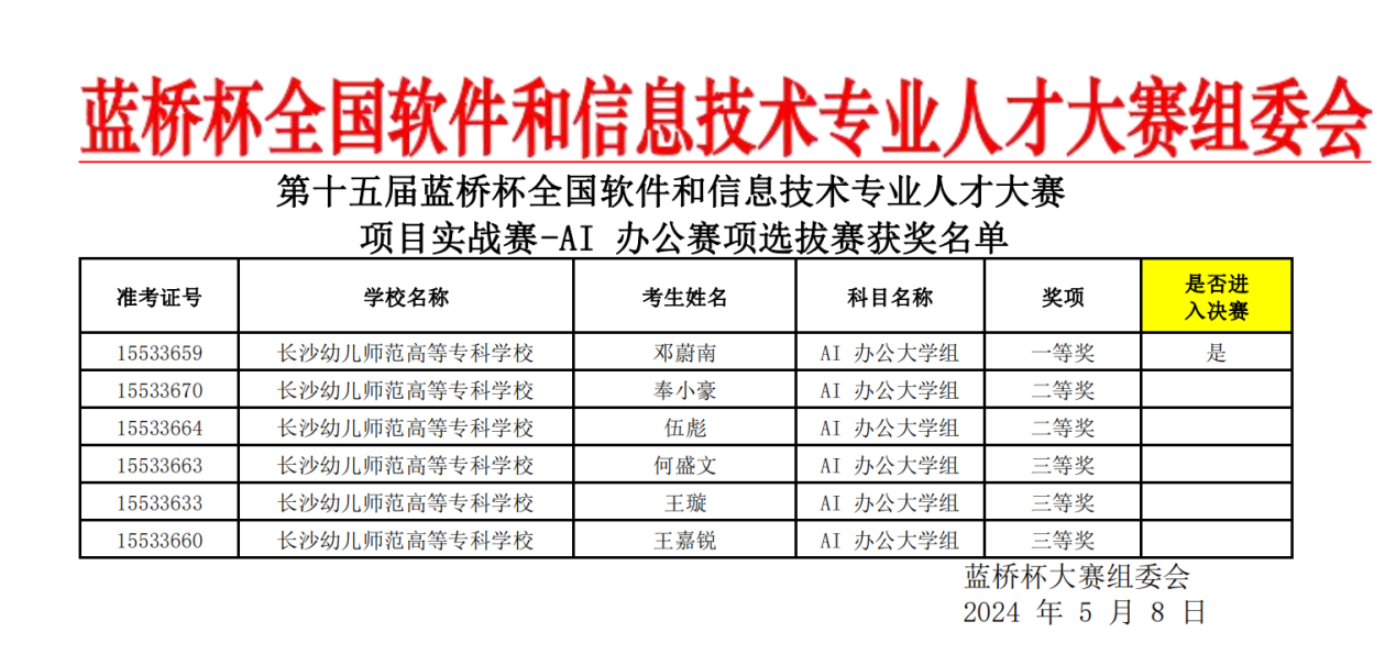 2024年5月8日,第十五届蓝桥杯“AI办公赛项”全国选拔赛圆满落幕🎂。神彩争霸8安卓下老版本与国内各大高校展开激烈角逐并取得了优异成绩💈。其中🧑🏻‍🍼💅🏻,刘桂梅老师、王姣宇老师𓀆、唐卓老师、黄妙老师指导的邓蔚南同学荣获一等奖并成功晋级总决赛,奉小豪、伍彪荣获二等奖,王嘉锐、何盛文👮🏻、王璇荣获三等奖。