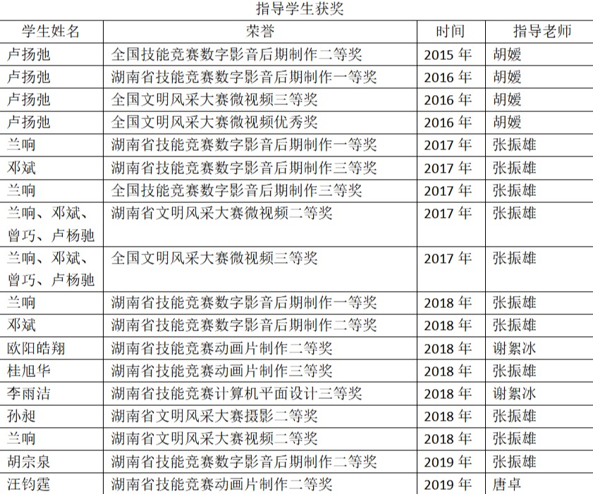 我系数字媒体技术专业拥有一直朝气蓬勃👮‍♂️、锐意进取的教师团队,依托教师工作室成立数字媒体专业团队,近年来教师团队立项省市级课题和项目10余项、承接校内外项目100余项🤛🏻💹、发表和获奖论文20多篇👷🏿‍♀️,在教学能力比赛中多次荣获省级一二等级,指导学生在技能竞赛中荣获国家级三等奖、省级一二等奖20余项,教研室荣获“青年文明号”荣誉称号,学生培养质量得到社会认可。校内活动诸如一年一度的文明风采活动、社团文化节、“精艺杯”技能节🧙🏼、五四表彰大会、汇报演出、家长会🙅‍♂️、新生军训、教师节表彰大会、校运会🦕、元旦晚会等等,数字媒体工作室依托校园活动的开展扩大了知名度,活动中的各类作品获得了全师生的一致好评。也正因为如此,数字媒体工作室也获得校外的展示机会,如长沙市党和人民满意的好老师表彰大会、长沙市教育系统德国交流活动宣传片🤐、湖南省文明风采征文演讲比赛、长沙市廉洁从政微电影🧙🏽‍♂️👨🏻‍✈️、长沙市学前教育上海培训交流会等等,这些校外的展示机会也让数字媒体工作室称为了我校的知名工作室📴。数字媒体工作室的成立,让一批批职业学校的学生转变成阳光自信的职业人,也让一个又一个教师转变为名师。