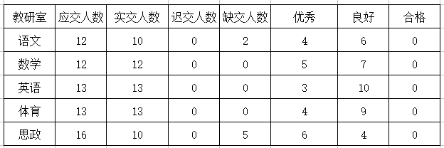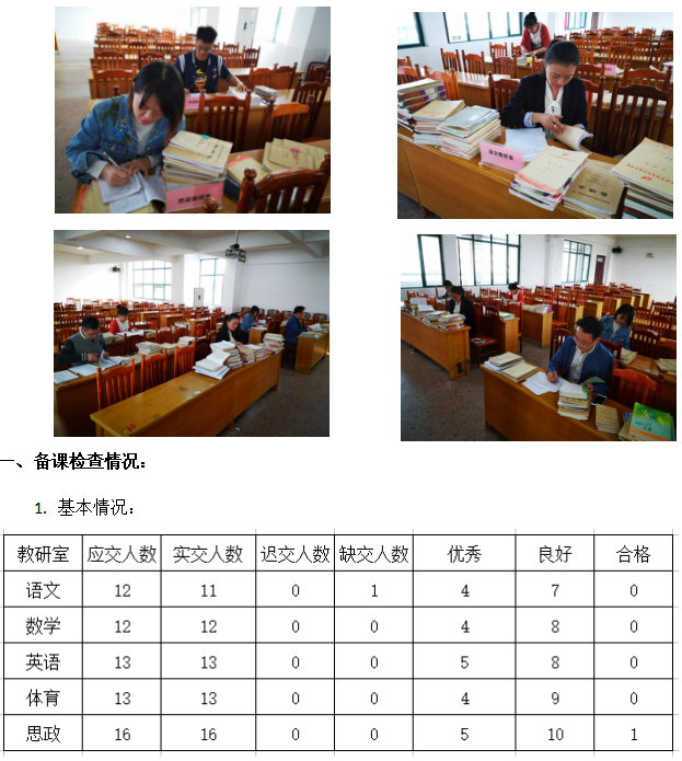 (1)本次教案检查绝大多数教师在备课中能严格按照学校规定的备课要求去做,根据教学大纲要求备课量基本达到要求,其中备课节数特别多的老师有英语教研室肖琼71节、邓玉峰54节、夏云33节、张婕30节;数学教研室黄武62节、彭跃明48节;语文教研室彭丹31节,林颖30节;思政教研室胡蓉26节、陈雯婧20节。