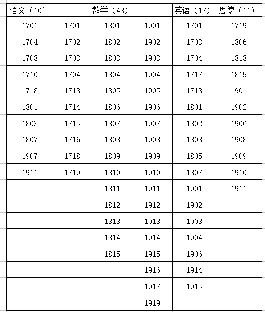 本次作业上交班级数统计:语文10个班;数学43个班;英语17个班;思政11个班。