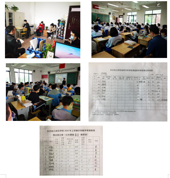 根据学校教务科下发的《2020年上学期开学教学常规检查方案》要求,公共课部组织各教研室主任召开了教学常规检查专题会议,布置了具体的工作任务和要求(提前两周的备课,疫情期间线上教学的相关资料,教学计划的审定和核查,推门听课和教学巡查等)。4月28日下午在德馨楼418室集中对公共课部所有老师的教案和教学计划进行了检查,对线上教学的相关资料进行了整理,每天安排专人进行教学常规的巡查,对巡查情况进行了登记和反馈。