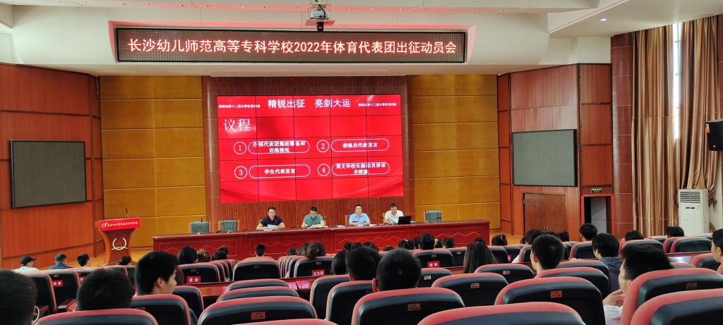 9月6日下午2点,湖南省第十二届大学生运动会神彩争霸8安卓下老版本体育代表团出征动员会在汇智厅召开,周文华副校长、教务处副处长罗斌、公共课部主任张胜春、公共课部副主任罗星出席动员会,全体队员和教练员参会,会议由张胜春主持。