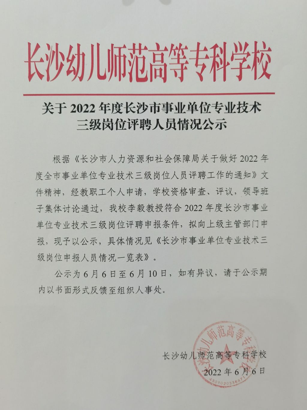 关于2022年度长沙市事业单位专业技术三级岗位评聘人员情况公示