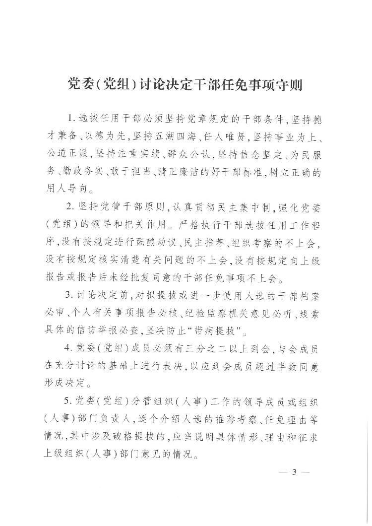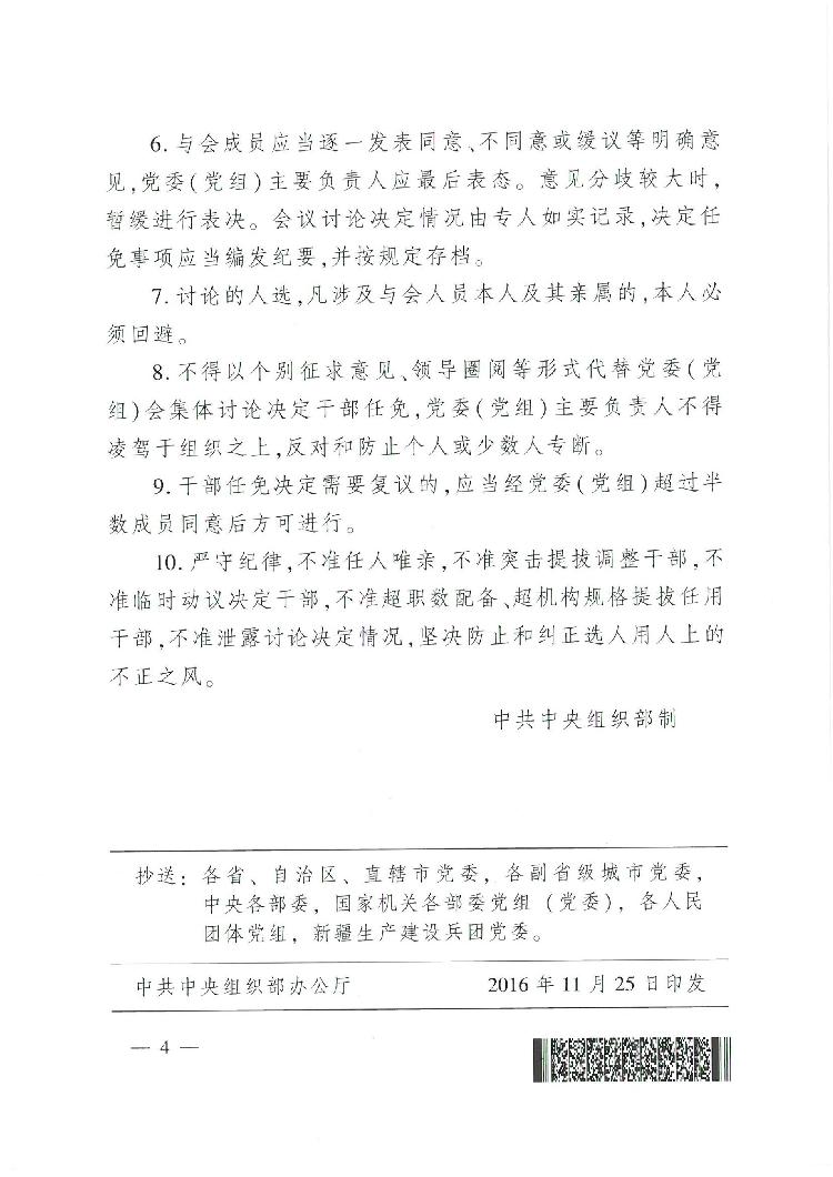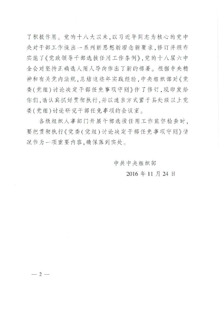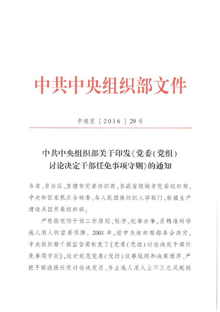 中共中央组织部关于印发《党委(党组)讨论决定干部任免事项守则》的通知(中组发〔2016〕29号
