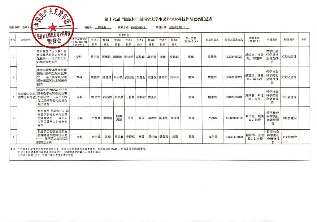 根据《关于组织开展第十六届“挑战杯”湖南省大学生课外学术科技作品竞赛的校赛通知》文件要求,经个人报送、学院推荐、专家评审等环节🙌🏼🧑🦱,学校共推选出5个项目团队参加省赛🗒,现将推选结果予以公示,公示期:2025年5月3日-2025年5月7日🧒,公示期如有异议,可通过书面形式或电话形式反应至评委会,联系电话:0731-85649938。