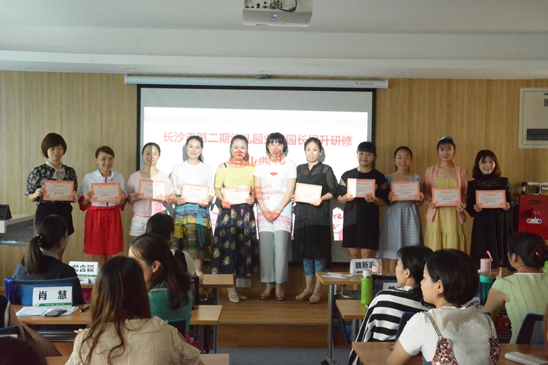 阳艳波为优秀学员颁发证书并合影留念,本次培训班在一片热烈的掌声中画上了句号。我们要将本次培训班学习到的知识、经验、技能作为一个新的起点,学以致用,为提升长沙市学前教育保教质量贡献自己的力量。