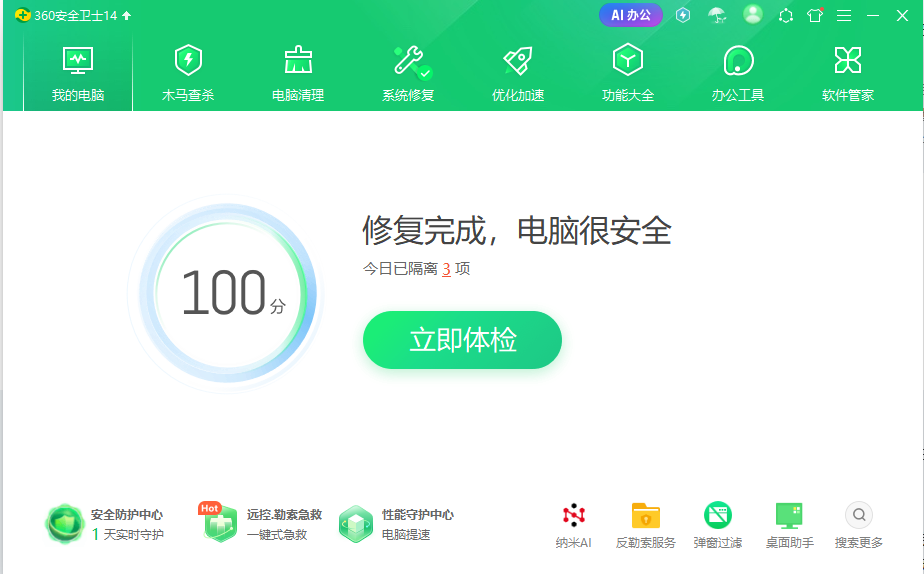 请确保办公及私人计算机已安装杀毒软件🤹,并运行杀毒软件📇,执行全盘扫描🫏,完成自检(示例如图)。