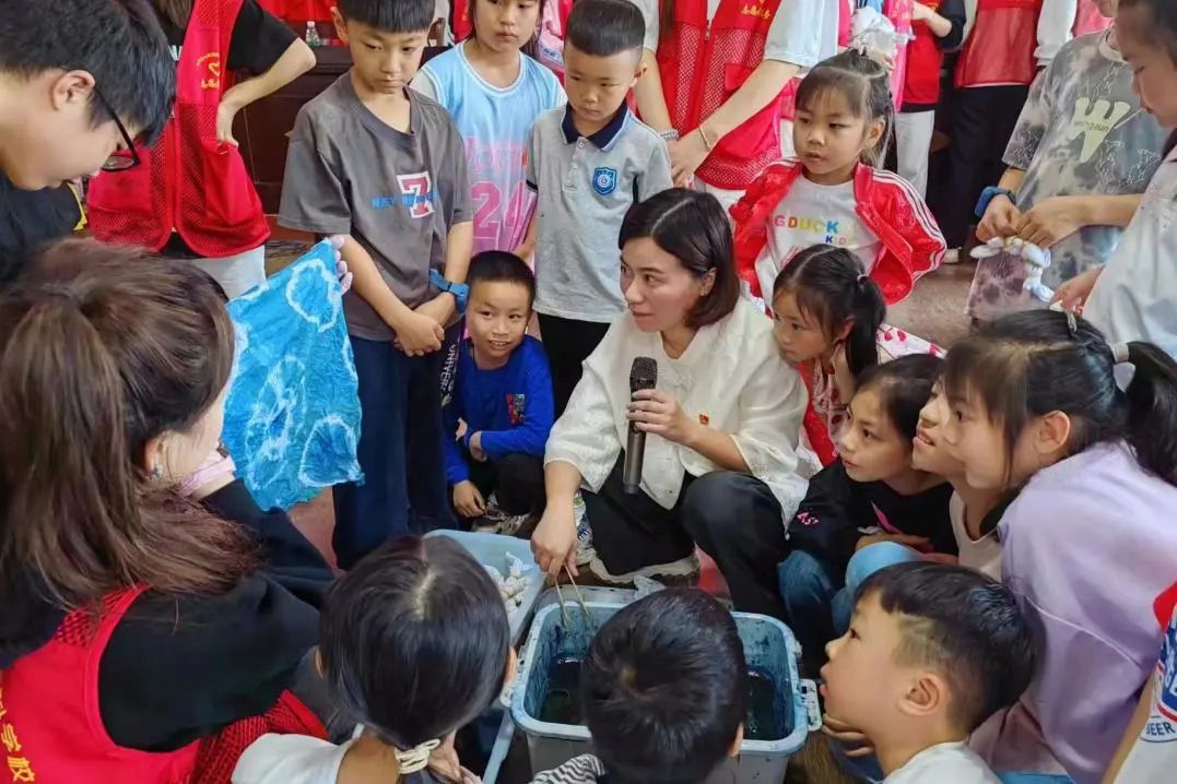为了让孩子们更好地了解和体验传统文化🌑,戴蔚蓉带领大家体验了扎染艺术。她首先向孩子们介绍了扎染的丰富历史和独特的制作技艺♌️,接着和志愿者一起带着孩子们实践,制作扎染作品💃🏼。一块方巾🧗♀️,扎一份童真🧑🏿⚕️,染一份传承🧑🏼🦳,孩子们零距离接触扎染,掌握扎染的基本手法,在自然中寻找“形”与“色”😮💨。