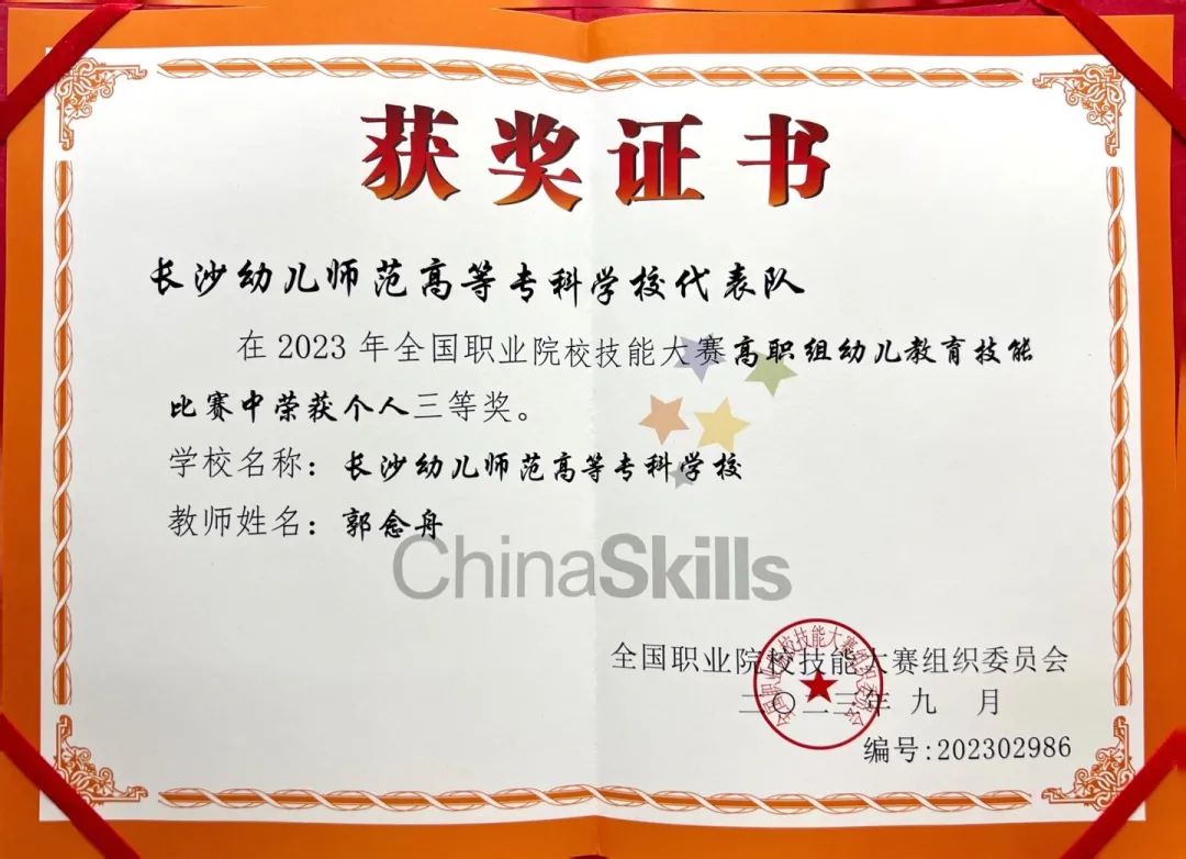 在9月3日结束的2023年“中银杯”全国职业院校技能大赛高职组幼儿教育技能赛项(教师赛)中,神彩争霸8安卓下老版本学前教育学院郭念舟老师代表我校参加该比赛项目,荣获个人三等奖。