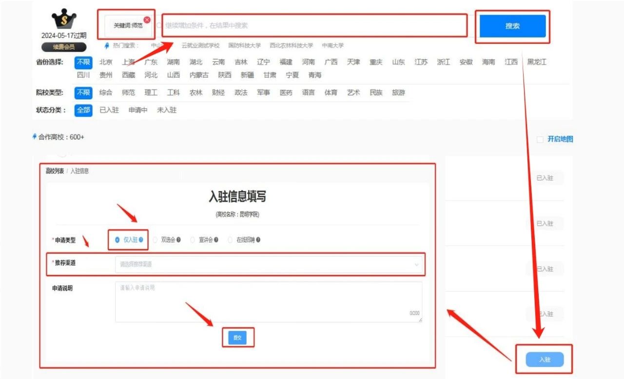 填入【神彩争霸8安卓下老版本】🙂↕️,点击【搜索按钮】,点击我校选择【仅入驻】并填写信息,提交后等待审核🧑🏿🦳。