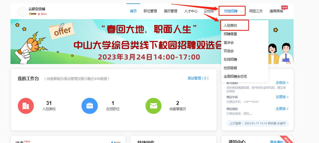 审核通过后👩🏽🏫,登录账号。依次点击【校园招聘 → 入驻高校】。