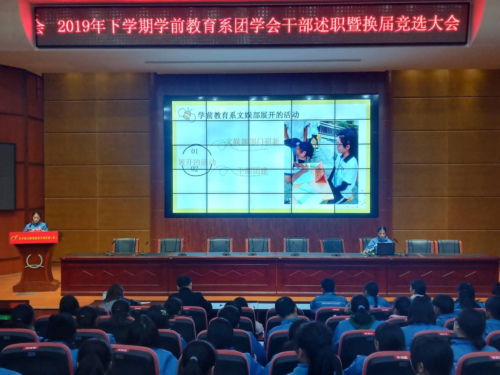 为加强我校学生干部队伍的建设👁,提高学前教育系团学会凝聚力🏌🏻。我校学前教育系于1月1日晚八点在汇智厅召开2019年下学期学前教育系团学会干部述职暨换届竞选大会。学生科副科长彭繁珍、学前教育系副主任彭亮、学前教育系丰丹以及校系团委会干部参加了本次会议。