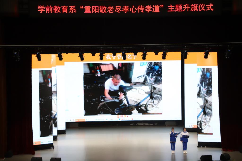 仪式伊始,主讲人讲述了与爷爷奶奶们的生活片段,让我们充分了解到与爷爷奶奶们相处是幸福的,美好的。但随着孩子们不断长大到爷爷奶奶不断衰老,相处的时间也不断减少,陪伴与尽孝道的时间也在变少。接着,主讲人讲述1909班的同学们利用周末时间开展了关于重阳节的活动,给奶奶吹头发、端茶、捶背,跟爷爷一起洗碗,帮爷爷奶奶洗脚等,并倡导作为一名学习了多项技能的幼师,可以在假期跳一段舞、唱一首歌,或者也可以动手做一份手工送给爷爷奶奶,孝老敬亲没有固定的标准和形式,老人们需要的是我们的陪伴与发自内心的关爱。“前人栽树,后人乘凉”,我们今天的幸福生活,正是在老一辈的艰苦奋斗中开拓而来。从重阳节到老年节,祈寿延年、厚德仁爱的文化传统一脉相承,孝亲敬老、关爱老人的时代内涵为传统佳节更添光彩。