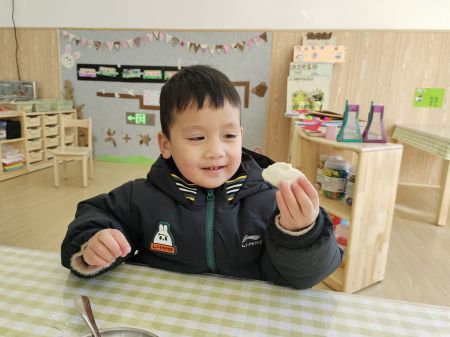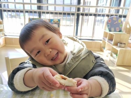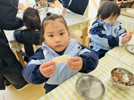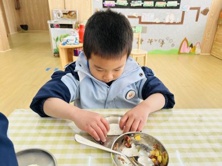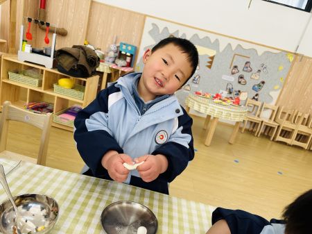 煊煊:这是我第一次包饺子,还挺好玩的呢📋,回家我也要和妈妈一起包。