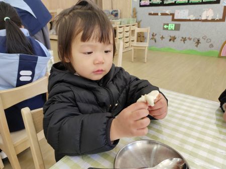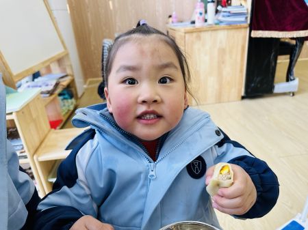 玥玥:跟我玩粘土一样,我喜欢包饺子 。