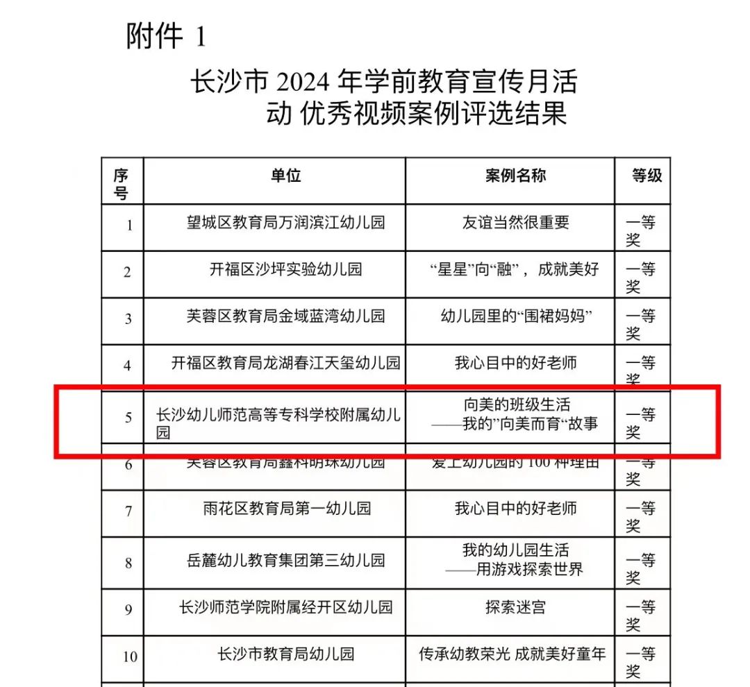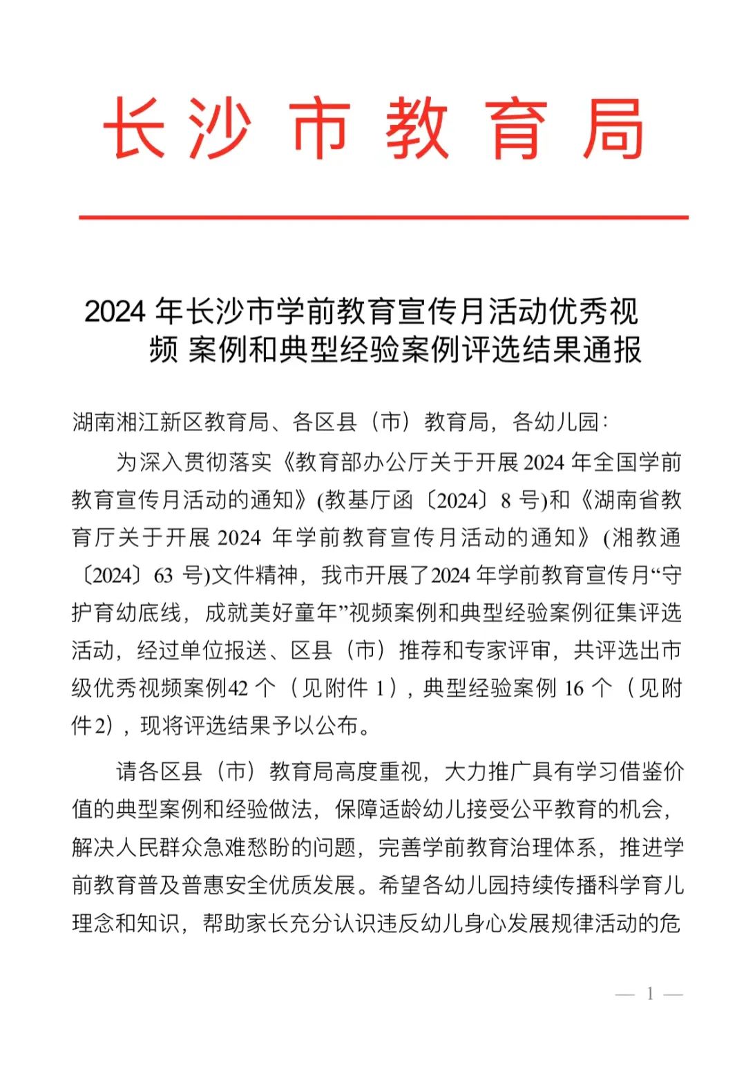 恭喜我园视频案例《向美的班级生活——我的“向美而育”故事》在2024年长沙市学前教育宣传月活动优秀视频案例和典型经验案例评选中获一等奖🔂。