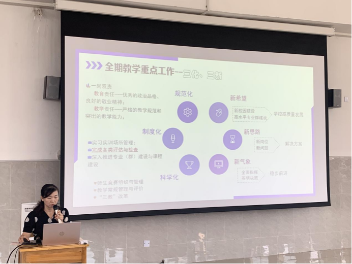 教务处副处长刘勇对本学期各项教学工作做出安排,提出了“三化,三新”。其中,三化是指:落实“一岗双责”,促进教学工作规范化;坚持固本强基,推动教学管理制度化;汇聚多方资源,打造教学常规科学化。三新指的是:新校园带来新希望,新思路解决新问题,新领导开辟新气象。同时,她对开学工作做出了具体安排,包括对开学重点事项时间节点的说明,还总结了“两点说明、三点提醒”。