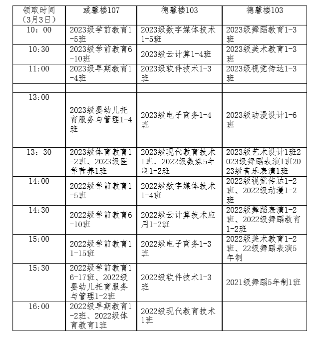 1、辅导员组织学生(根据教材分班表上所领教材种数)以班级为单位按指定时间到德馨楼103、彧馨楼107领取教材。