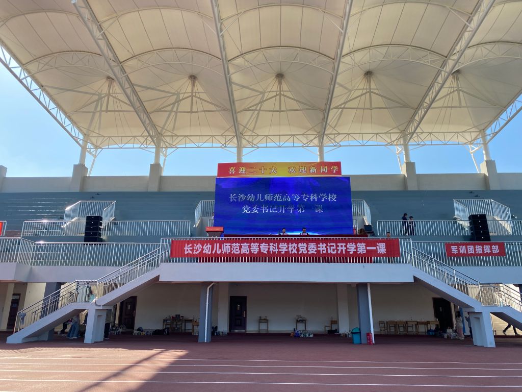 10月20日下午3点,长沙幼儿高等师范专科学校党委书记肖思源在湘江新区新校区为正在进行军训的2022级新生讲授“开学第一课”。2200余名师生齐聚田径场,同上一堂课,共享青春范。