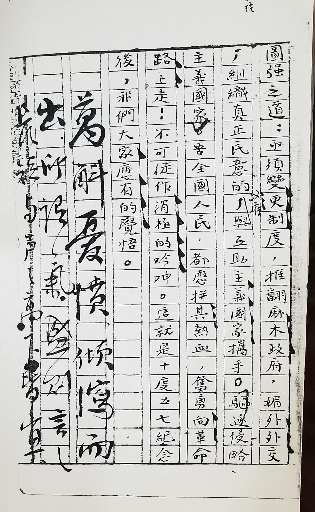 图强之道:亟需变更制度🎣,推翻麻木政府,媚外外交;组织真正民意的(政府),与互助主义国家携手,驱逐侵略主义国家。吾全国人民,都应拼其热血🙆‍♀️,奋勇向革命路上走!不可徒作消极的吟呻。这就是十度五七纪念后🦊,我们大家应有的觉悟。