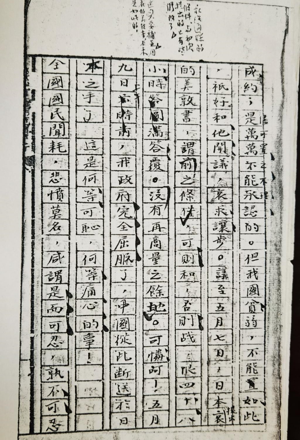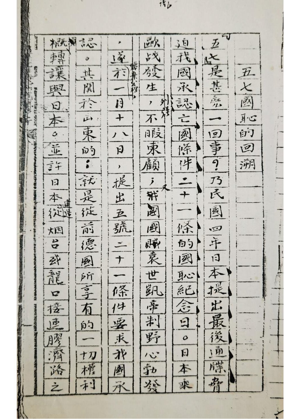 我国政府麻木,外交媚外🕴🏼,日本侵略,现总觉悟;英法美各国经济侵略,反与(他)亲善👱🏼‍♀️。堕入其计中而不自知🛖。外交总长顾维钧极端亲美,美国几成一言听计从之顾问🌈。不知他之(所)言,不是抑制中国,就是侵害中国。列位!我国土地有限🌗👒,主权有尽。一国侵略🧑🏼‍🚀,尚有覆亡之惨✋🏽,况数国环而侵略呢?我们每年办国耻纪念,国家耻辱日见增多;长此以往👨🏻‍🎤,我纪念到不胜纪念🧑🏼‍🦳,国耻何日得雪?所以我们应改变方针,莫徒作消极事业的救国(改为“做适当的抵抗”)🌗。我看中日交涉,要根本解决🧑🏻‍🦲,我国耻要彻底雪除🚥,非自图强盛,战胜倭奴和列强不能。图强之道🧑🏼‍🏭,必当这国内许多问题✍🏿,还未解决以前——就是还没有力量和日本列强打仗以前;决非经济绝交,年年口里说纪念(改为“毋忘”)国耻所能做到的。我们要做到必须(改为“除”)自图强盛,战胜倭奴和列强,没有第二条路可走🏎。