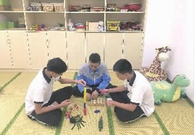 5月31日,长沙信息职业技术学校学前教育专业1706班三位男生正在实训室里练习积木游戏。