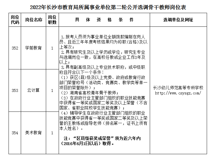 2、《岗位表》“具体资格条件”中要求的“区县级获奖或荣誉”须为近六年内(2016年6月1日以后)取得。