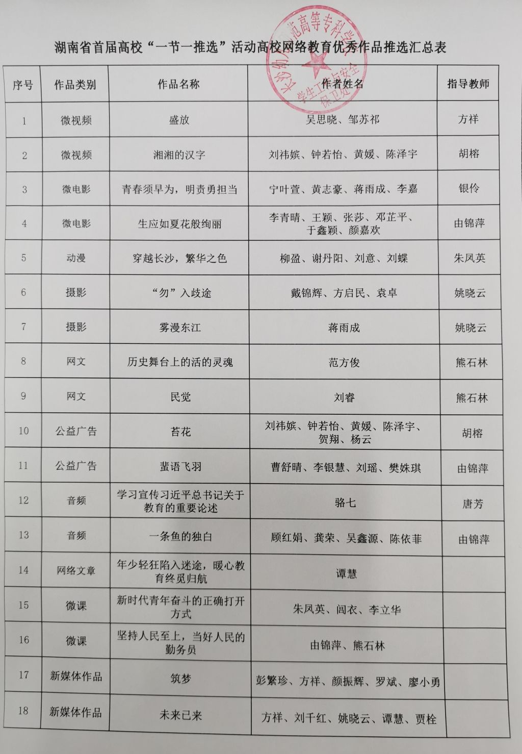 湖南省首届高校“一节一推选”活动于2023年10月启动🆓,在各学院的积极组织发动下,截止到12月21日共收到10个项目共计54件作品,学保处组织相关老师进行盲评🎻👚,共评选出18个作品参加省赛🤹🏽,现将评选结果公示如下🐖🛠,公示期为2023年12月22日--12月25日🙎🏽。如有异议🙏🏽,请到道馨楼208室廖老师处进行反馈。